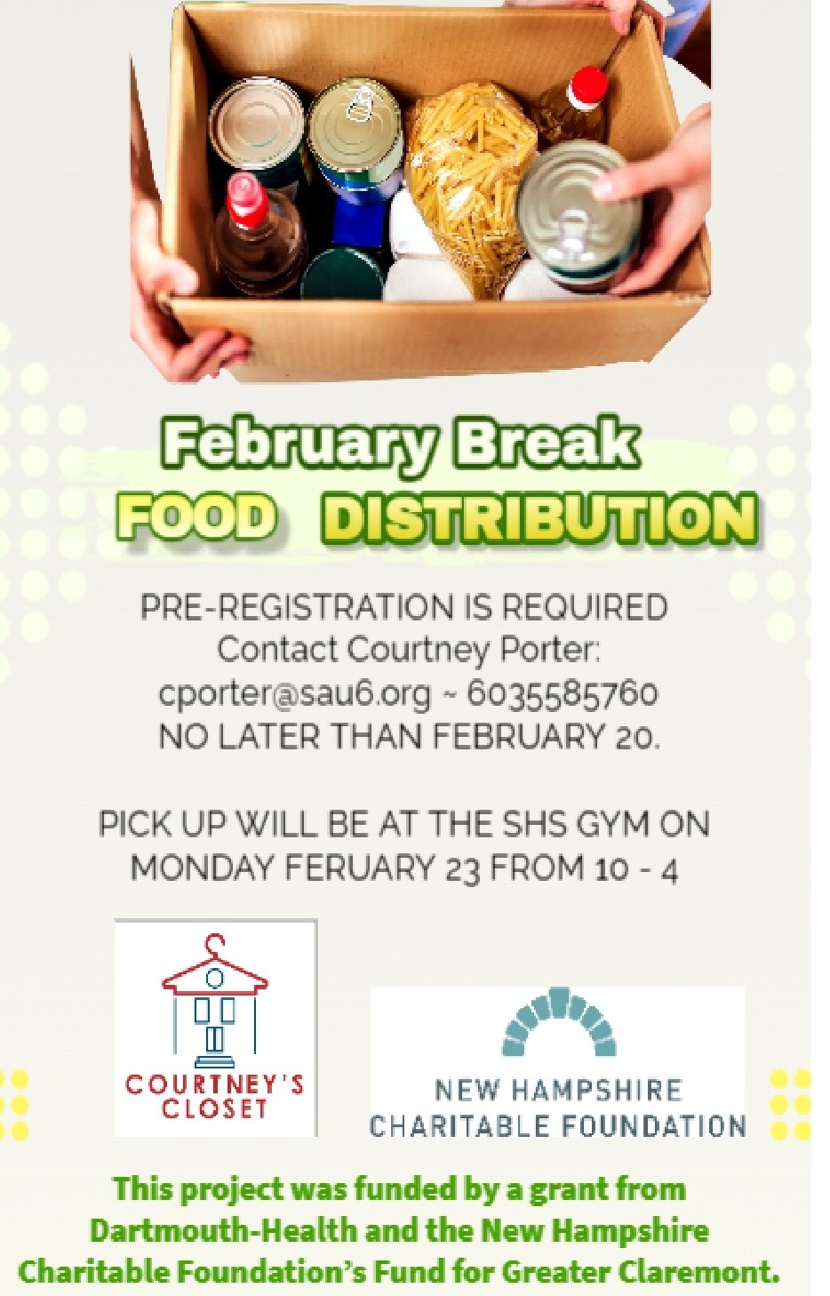 If your family is in need of food assistance for next week's February break, please reach out to Ms Porter by Friday morning, February 20, 2026 ~ cporter@sau6.org